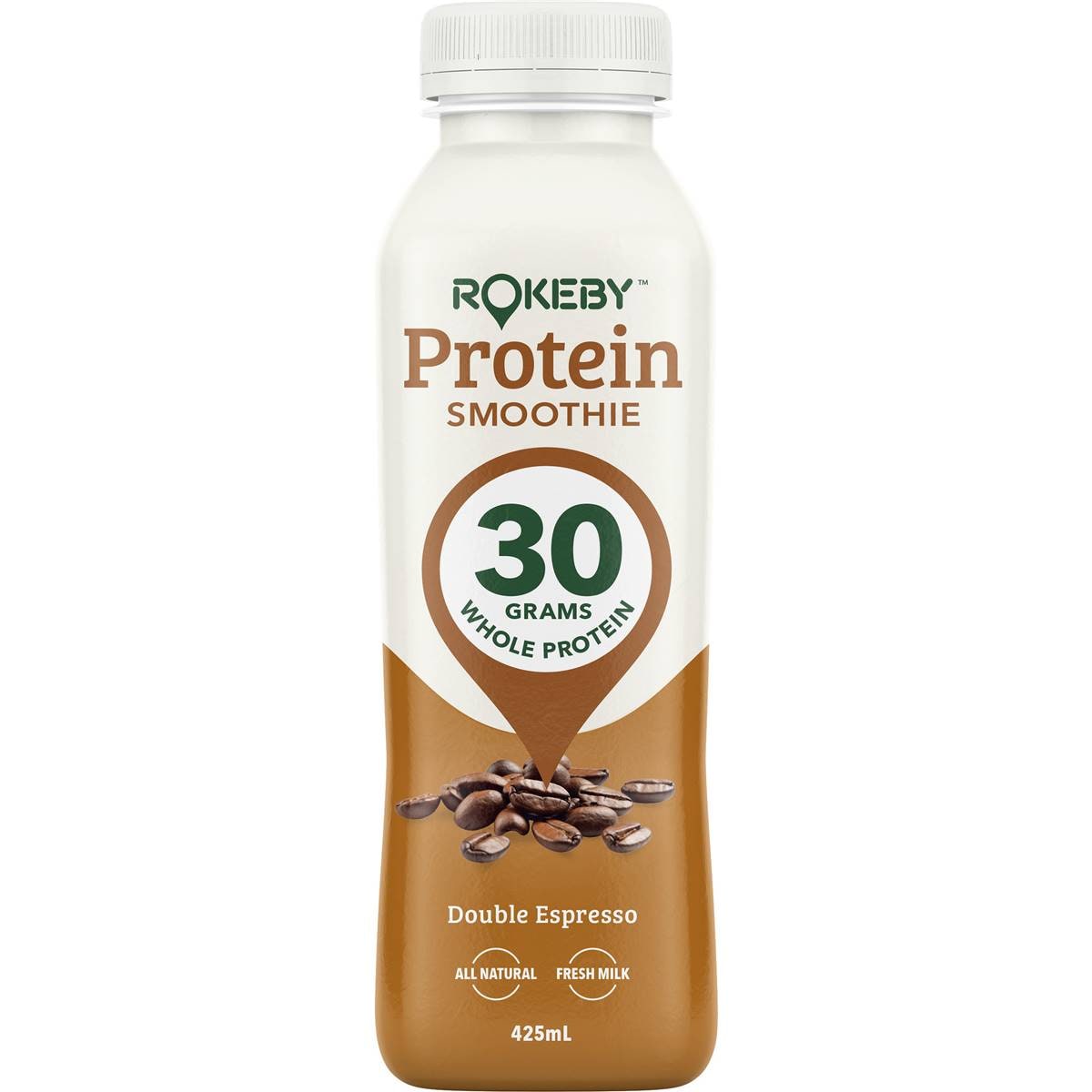 Rokeby Farms Protein Smoothie. Rokeby Protein Smoothie Double Espresso 425ml Woolworths Made with real cocoa, this pure protein smoothie uses cold-filtered fresh milk and contains 30 grams of fresh farm protein We actually use 2 litres of fresh milk to create 1 litre of Rokeby Farms milk